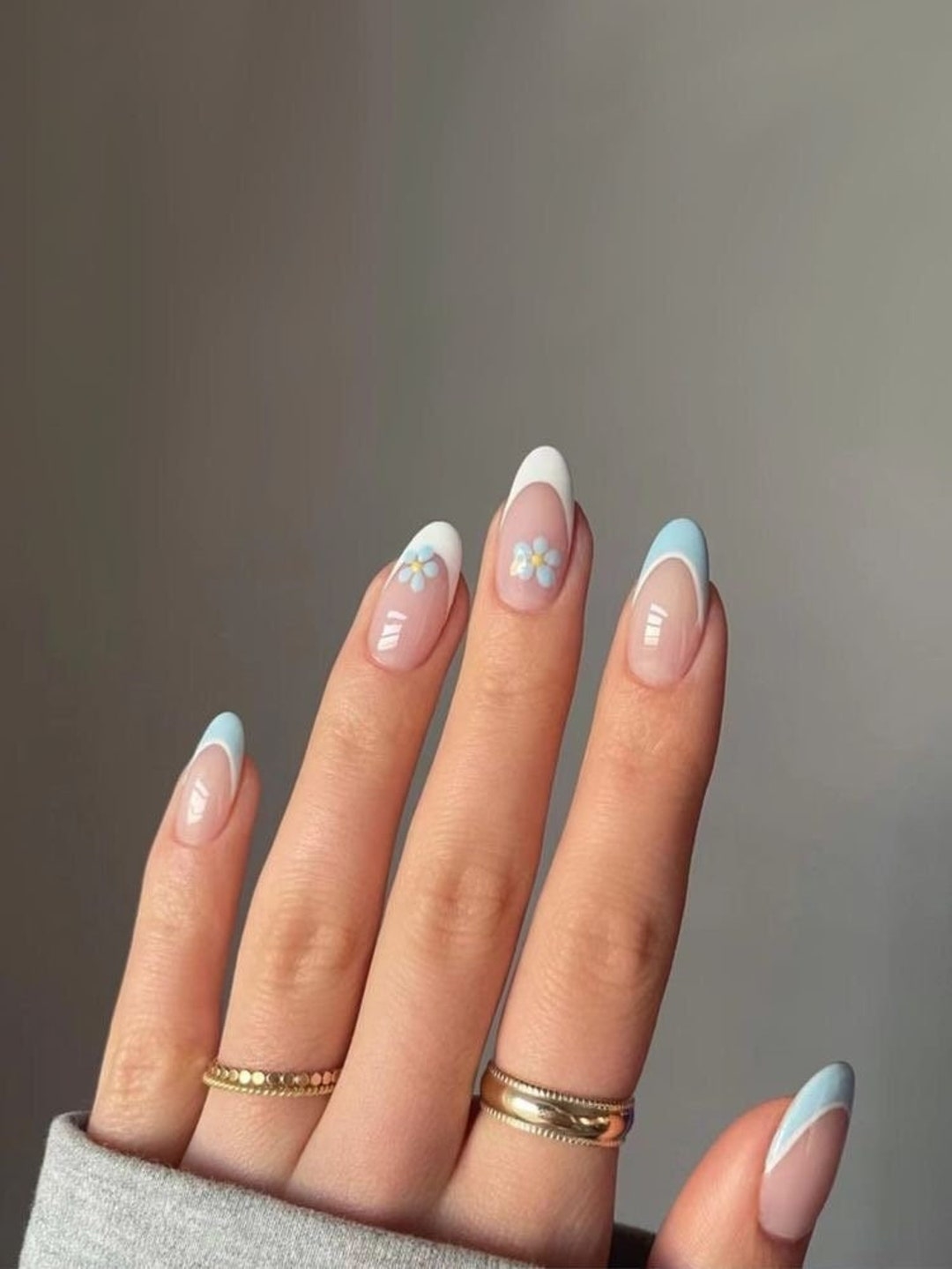 Blue Floral French Almond Press On False Acrylic Nails Press On Extension Handmade Etsy
