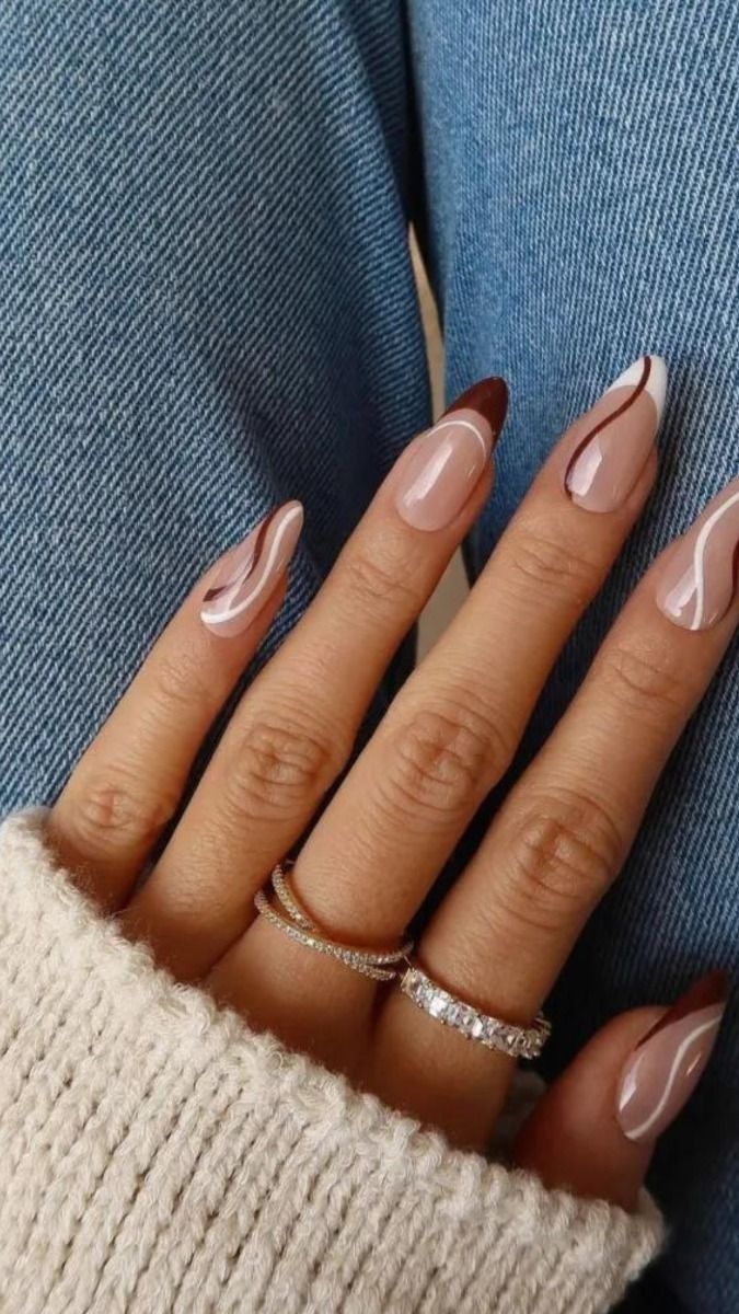 Brown White Waves Nails
