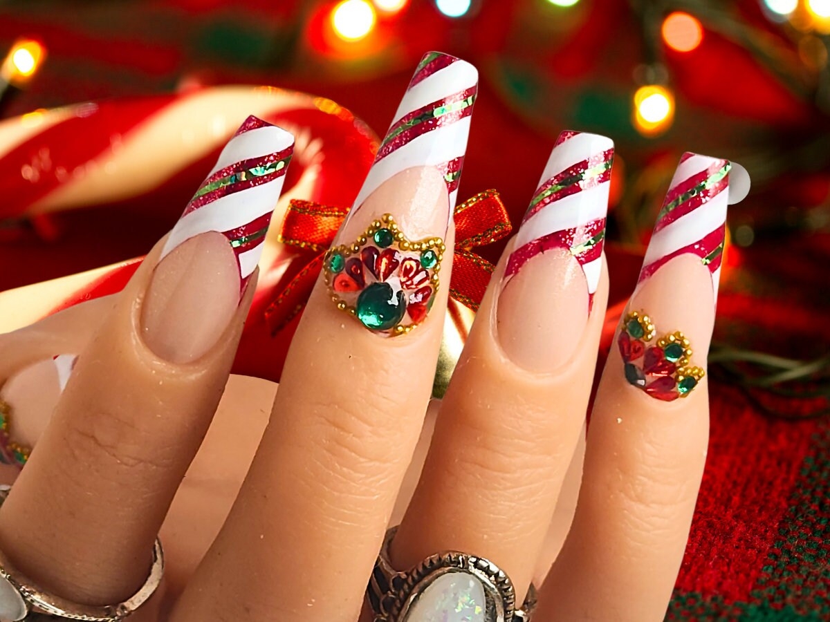 Candy Cane Press On Nails Christmas X mas Nail Art Winter Glam Inspo Press Ons Fake Nails Rhinestone Accent Luxury Nail Design Etsy
