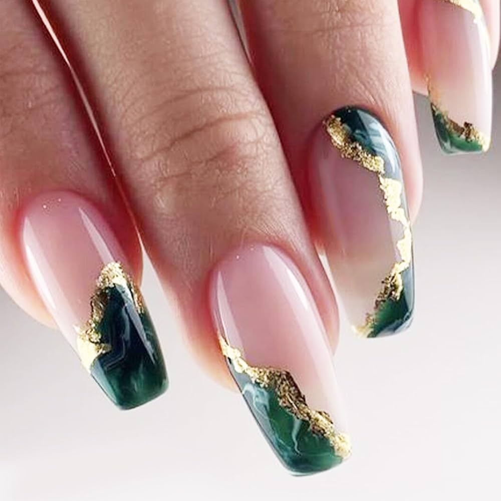 Amazon Dark Green Press On Nails Medium Marble False Nails With Glitter Designs Glossy Gold Foil Coffin Shape Reusable Acrylic Full Cover Artificial Nails Glue On 24pcs Beauty Personal