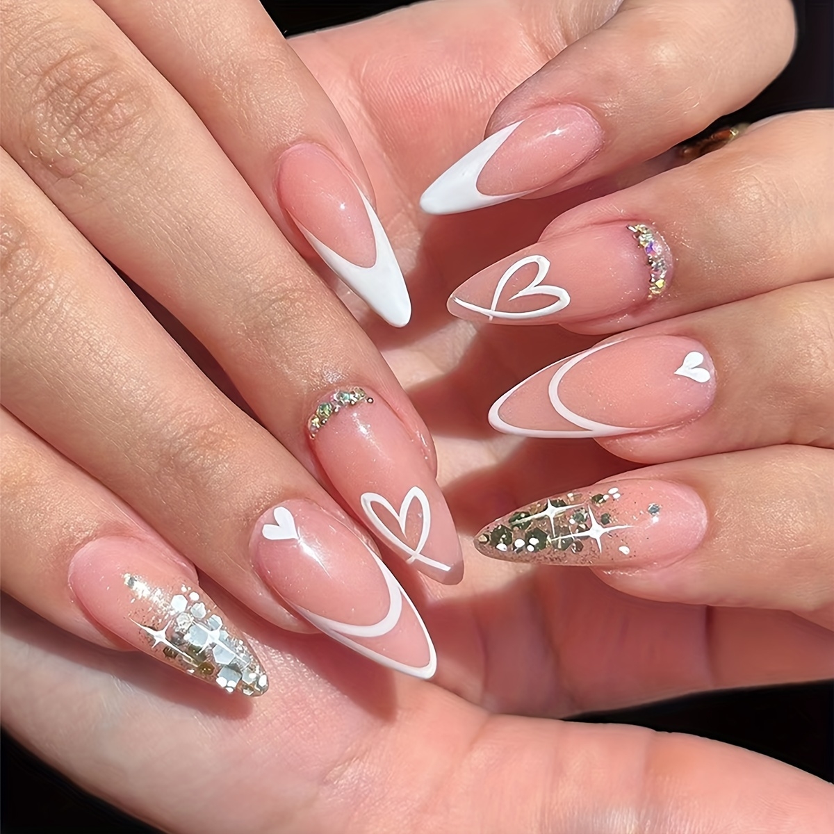 White Stiletto Nails With Glitter Sold On Temu United States