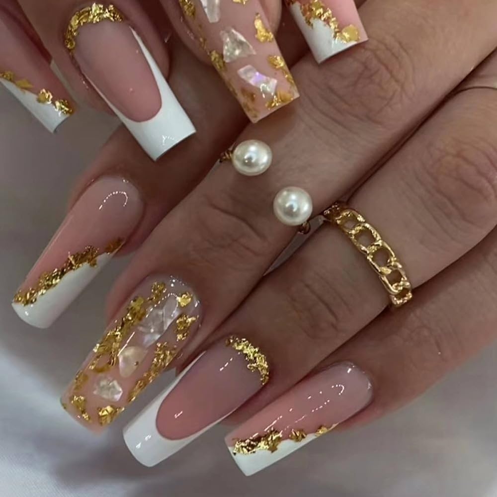 Amazon MERVF Coffin Press On Nails Long Fake Nails White French Tip Ballerina Glue On Nails With Gold Designs Acrylic Nails Artificial Glossy False Nails 24pcs Beauty Personal Care